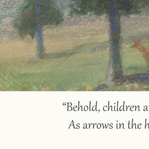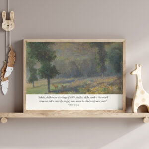 This tender Scripture art piece features a soft, vintage landscape with deer in a quiet meadow—an image of calm, nurture, and the beauty of new life. Beneath the illustration, the words of Psalm 127:3–4 are displayed with the sacred Name included, honoring the fullness and reverence of the text: