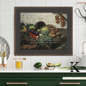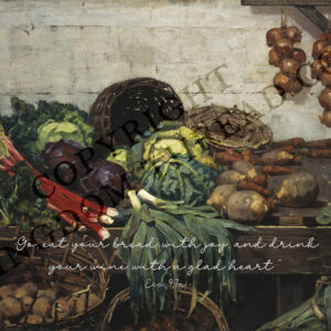 This scripture fine art print is a beautiful vintage art print featuring a lovely vintage still life of fresh garden produce and the first part of the verse from Lamentations chapter 9 –