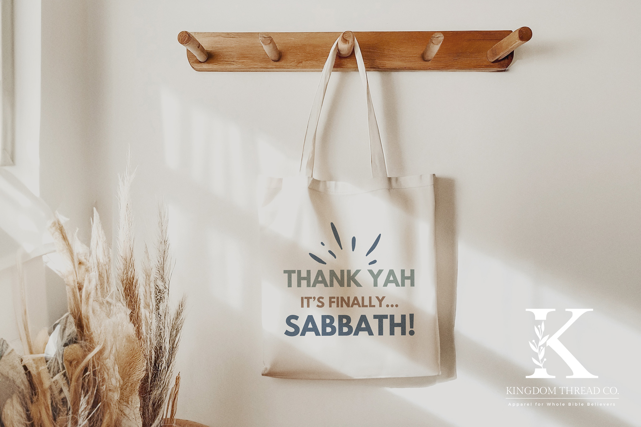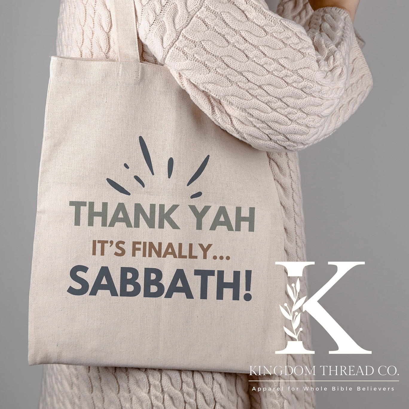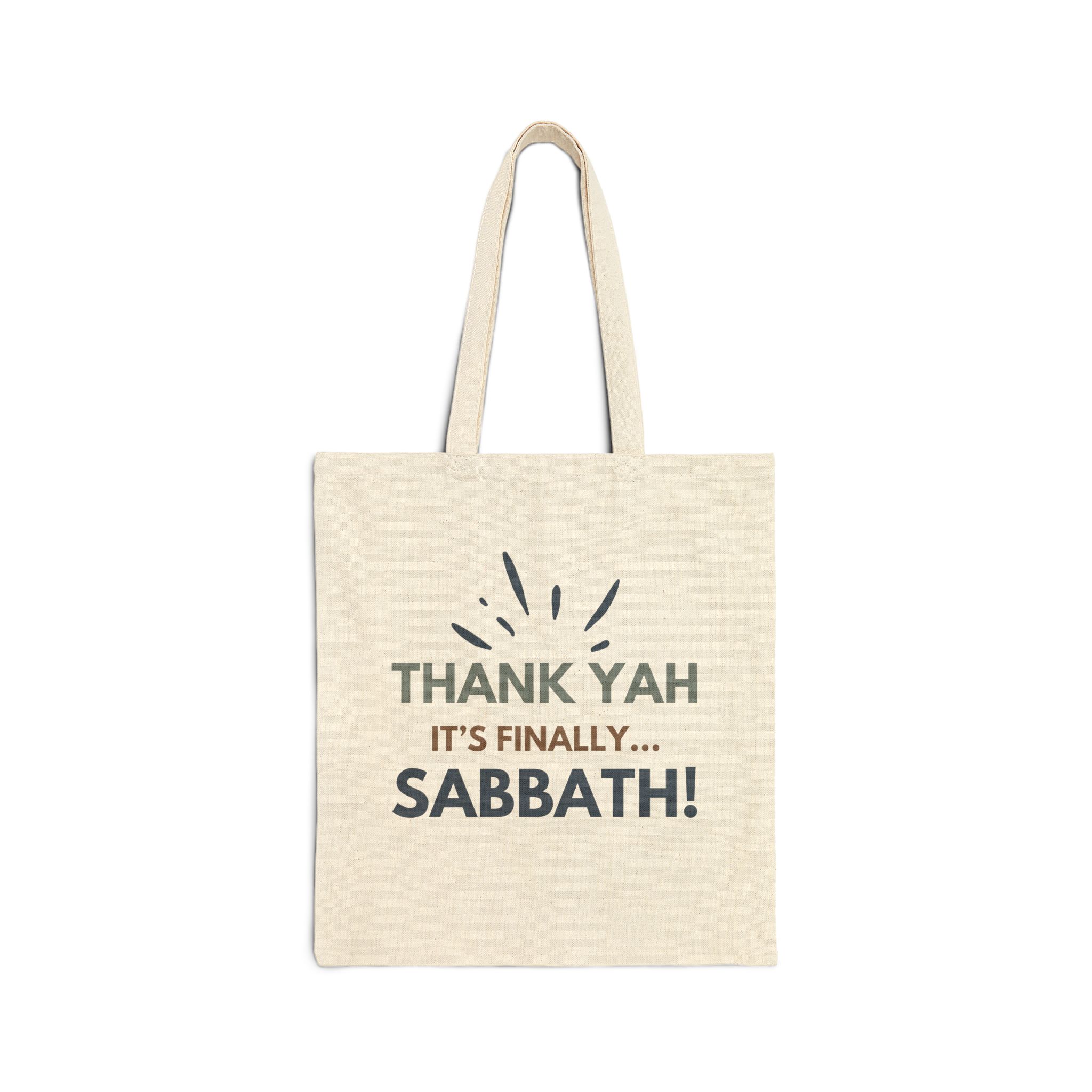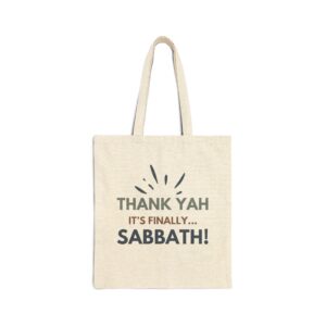 Introducing our Cotton Canvas Tote Bag, the perfect blend of style and sustainability. This is one of our Sabbath bag designs, and is perfect for taking your Bibles, notebooks, and other essential items to your Sabbath gathering! This beautiful tote features a typographical print in blue’s and brown’s that says “- “Thank Yah, It’s Finally… Sabbath!” I know all of us keeping the Sabbath can FULLY relate to the relief and joy that this set-apart day brings.