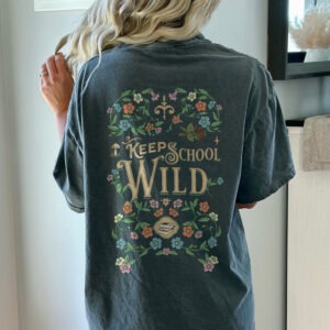 This one is a beautiful design that has “Homeschool Mama” on the front, and a beautiful floral design on the back that states “Keep School Wild”. This shirt is showcasing what a lot of homeschoolers do as part of our normal schooling.. we’re in the wild! Foraging & observing nature is a huge part of our homeschool fun, and that’s what this shirt showcases!
