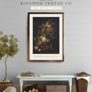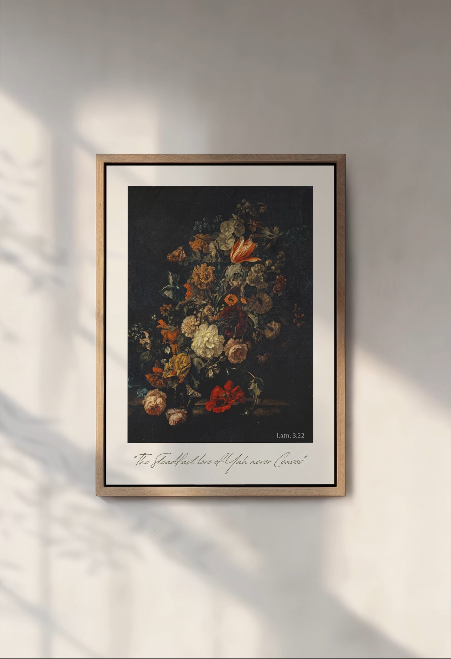 The vintage art print is an antique floral with a dark and moody background and would look so pretty in a gold leaf frame!