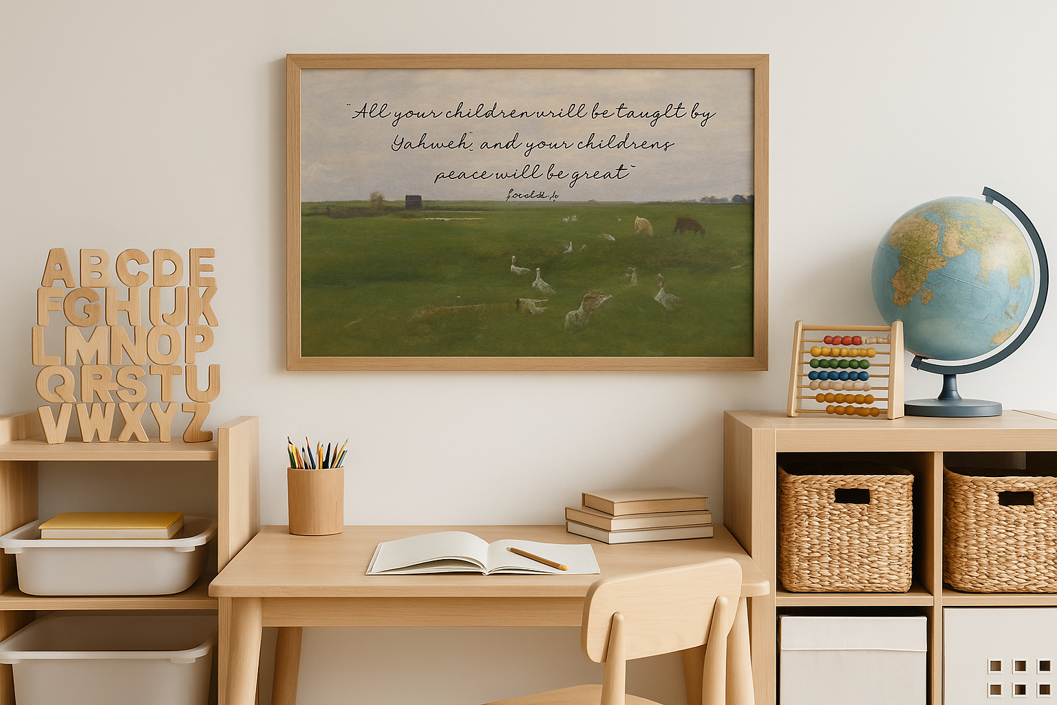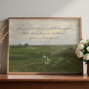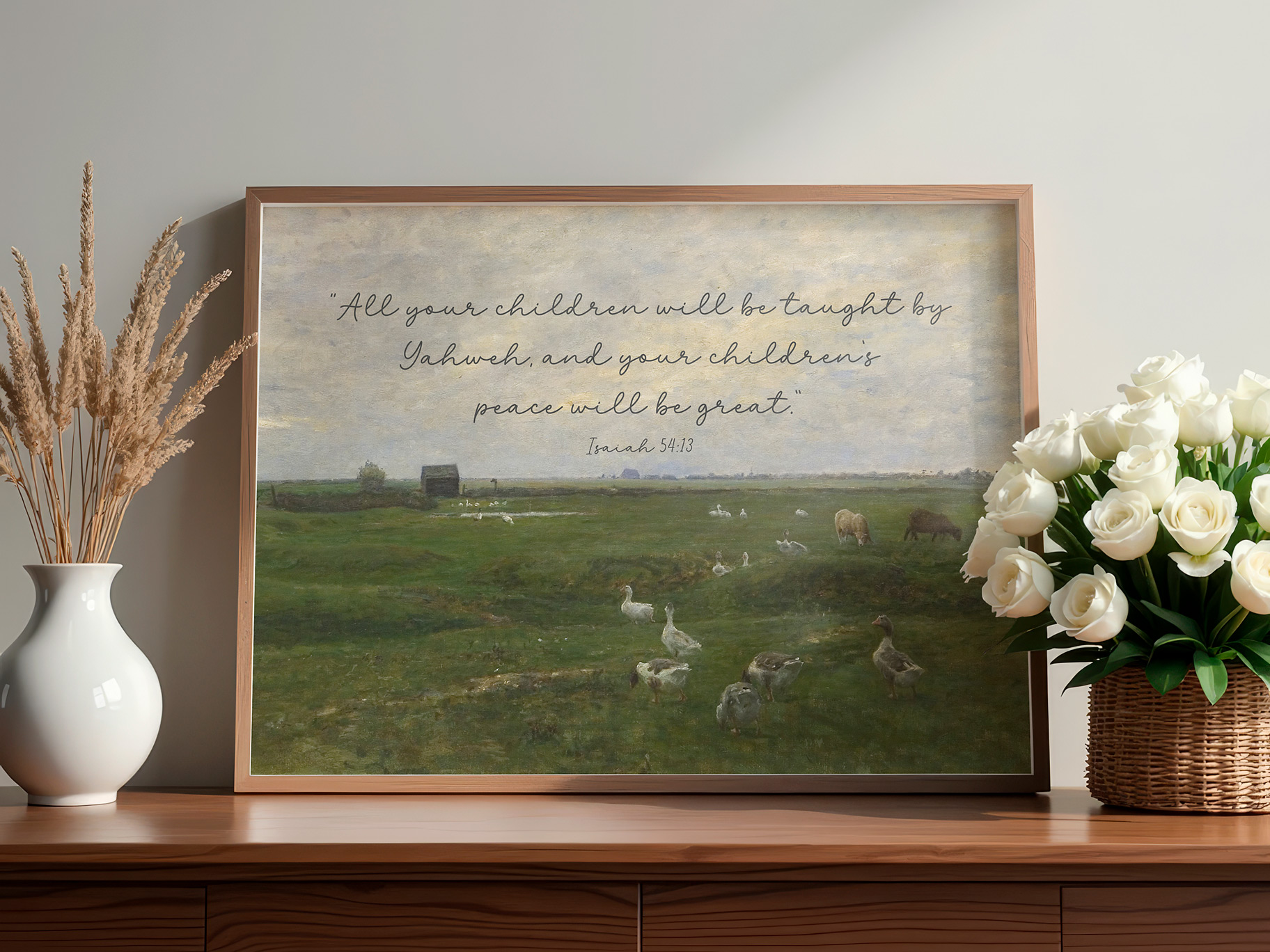 This tender Scripture artwork features a peaceful countryside scene—soft green fields, grazing animals, and the quiet calm of early morning light. Over the landscape is written the promise of Isaiah 54:13, a verse cherished by parents and families who desire to raise children in the ways of Yahweh: